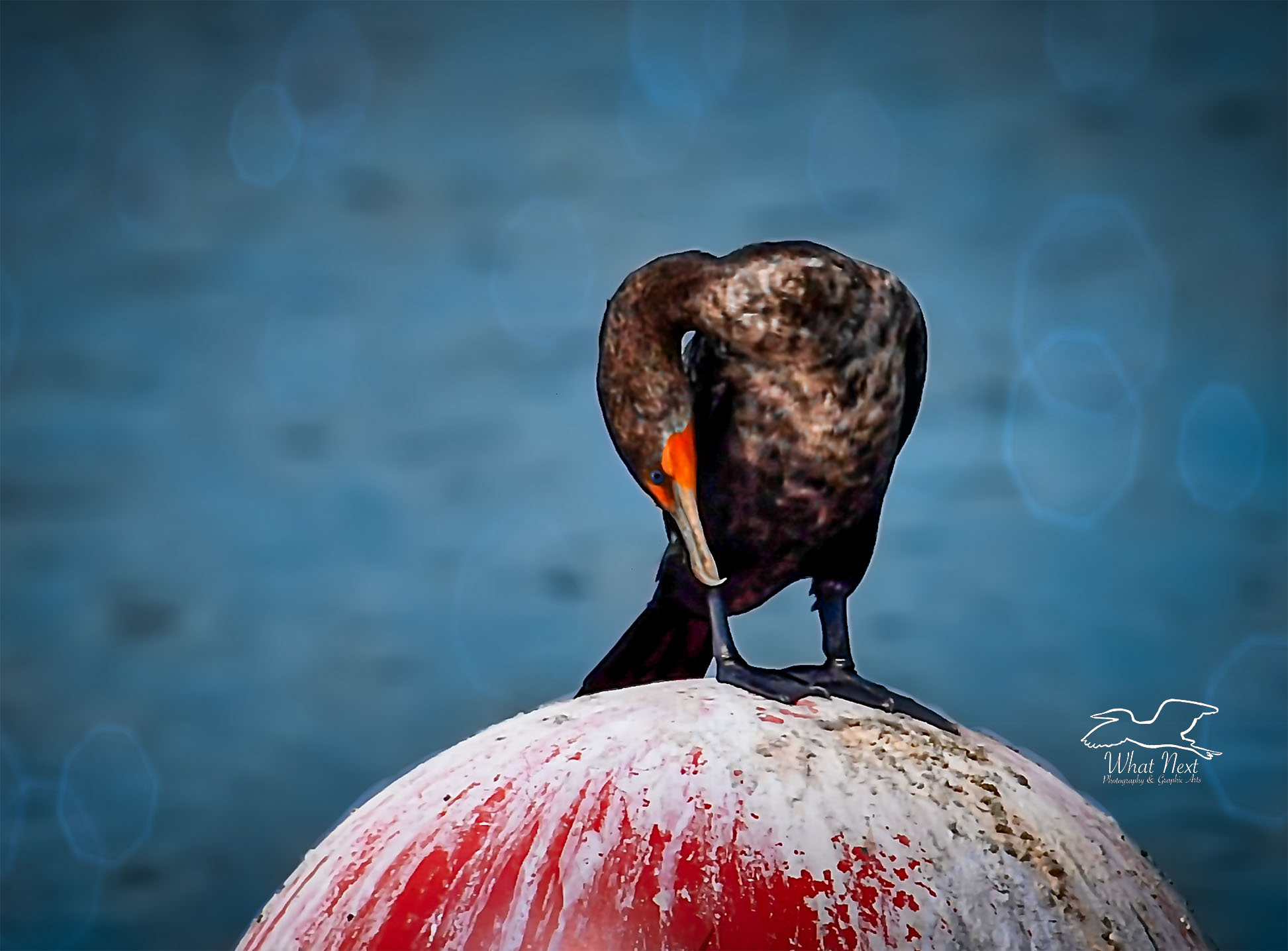 When I was out at Fort Island Gulf Beach earlier this week, there were quite a few cormorants perched on the buoys that mark the swimming area. As you can see, these buoys are common perching places for the birds at the beach. Apparently, it’s okay to clean your feathers anywhere, even if it’s in a filthy place.