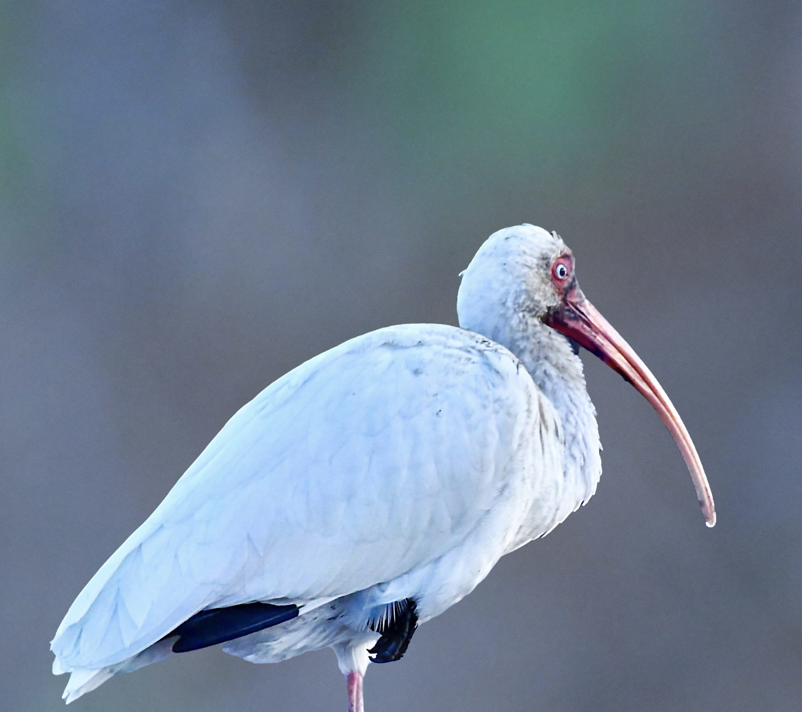 Yesterday I went out to Cedar Key to watch the birds and hopefully see some winter migrants. It turned out to be a good day and I saw quite a few birds, including several winter visitors. I thought that I was through for the day and was headed back to my truck where this American white ibis (Eudocimus albus) was resting on a post just across the street. My camera was still in hand, so of course why not get in one more shot. I hadn’t noticed at first, but when I saw the bird through the camera lens, I realized that its face and feet were very muddy. The tide was out, so the mud flats were quite exposed and I’m sure this bird had been out there foraging for food earlier. These guys feed by probing the ground and shallow water with their long, very sensitive beaks. When the tide is in the water washes away the mud or they feed on the beaches where it isn’t muddy, but when the tide is out the mud is fair game. Throughout the course of the day I had seen quite a few of these birds out on the flats probing away and seeming to be pretty successful. This one had apparently finished for the day and seemed pretty relaxed perched in the post on one leg. It didn’t seem to mind a muddy face or feet, so why should I?