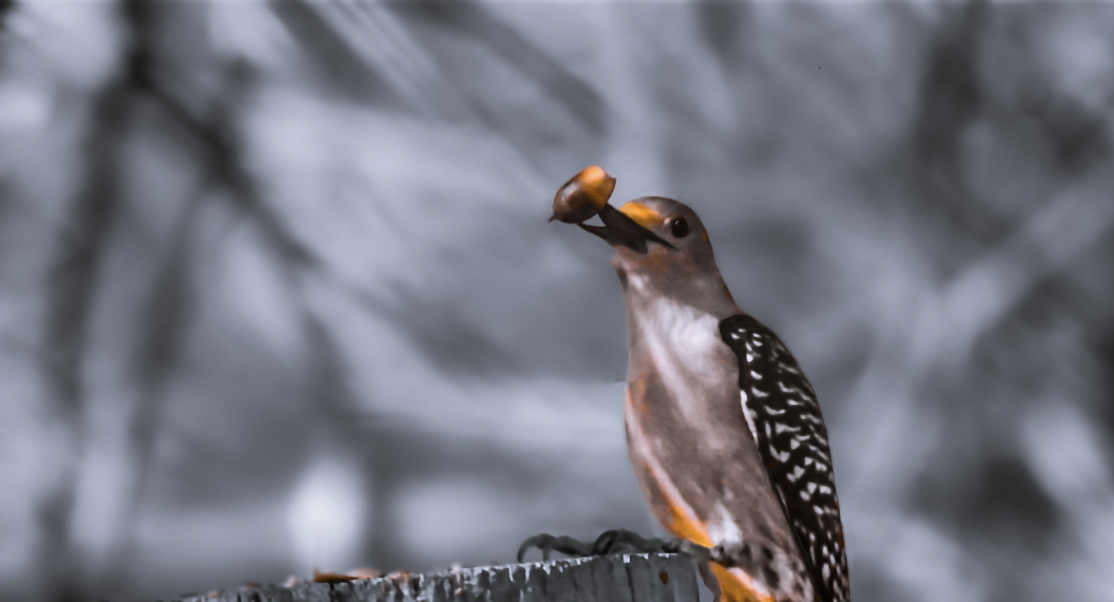 Acorns, which are the fruit (or nut) of the live oak tree, are highly edible and lots of wildlife really love them. Among them are quite a few birds, including red bellied woodpeckers (Melanerpes carolinus). This pretty female woodpecker had found one and was in the process of breaking its shell open. She had placed it on top of the post and stabbed it several times with her beak. Once she had a hole in the nut and could really grip it, she smashed it into the post top several times to finish breaking the shell. If you look closely at the top of the post, you’ll notice bits of shell scattered there. It only took her a few seconds to open the nut, but much longer to consume the tasty treat inside.